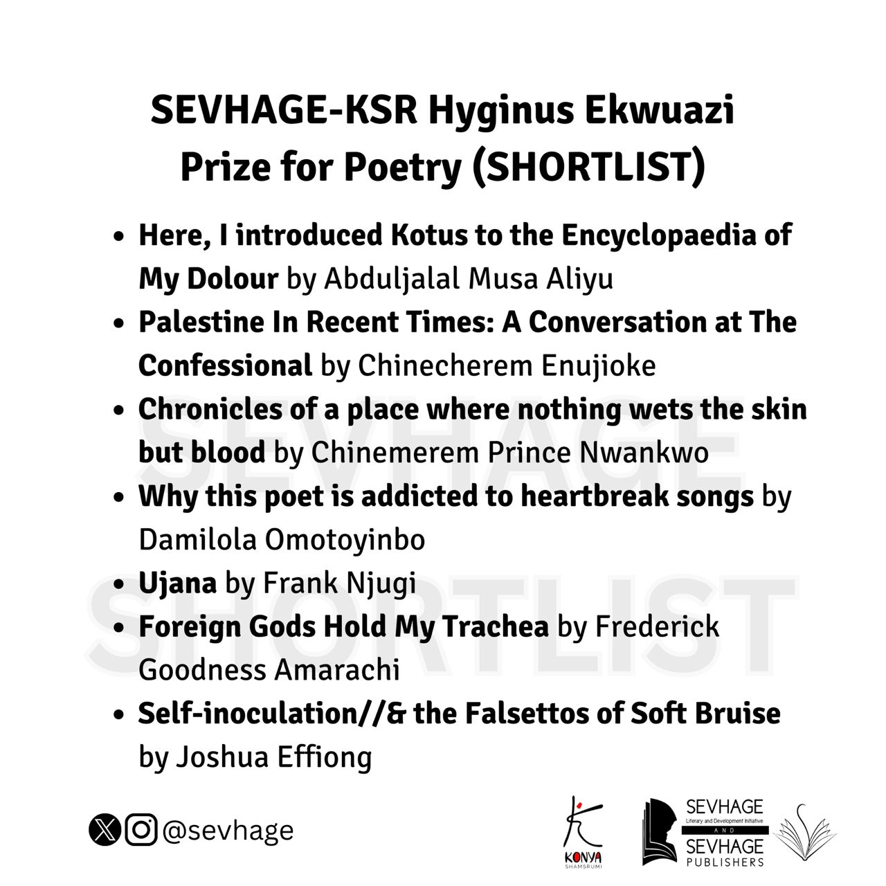 After critical readings and reviews, we are delighted to unveil an extensive shortlist for the poetry component of the SEVHAGE Literary Prizes 2023, named in honour of the revered Professor Hyginus Ekwuazi, and in collaboration with the African poetry collective, Konya Shamsrumi. In alphabetical order by first names, the works and their authors are as follows: