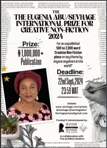 CALL FOR SUBMISSIONS: THE EUGENIA ABU/SEVHAGE INTERNATIONAL PRIZE FOR CREATIVE NON-FICTION 2024 [DEADLINE: 22nd September 2024 11:59pm WAT] – NO ENTRY FEE