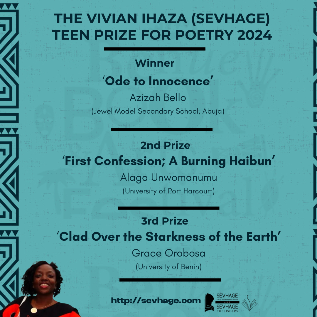 The Vivian Ihaza (SEVHAGE) Teen Poetry Prize is one of the core components of the SEVHAGE Literary Prizes organised by SEVHAGE Publishers and SEVHAGE Literary and Development Initiative. The judges for the Vivian Ihaza Prize 2024 are the celebrated poets, Dami Ajayi, Olajide Salawu, and Rasaq Malik.