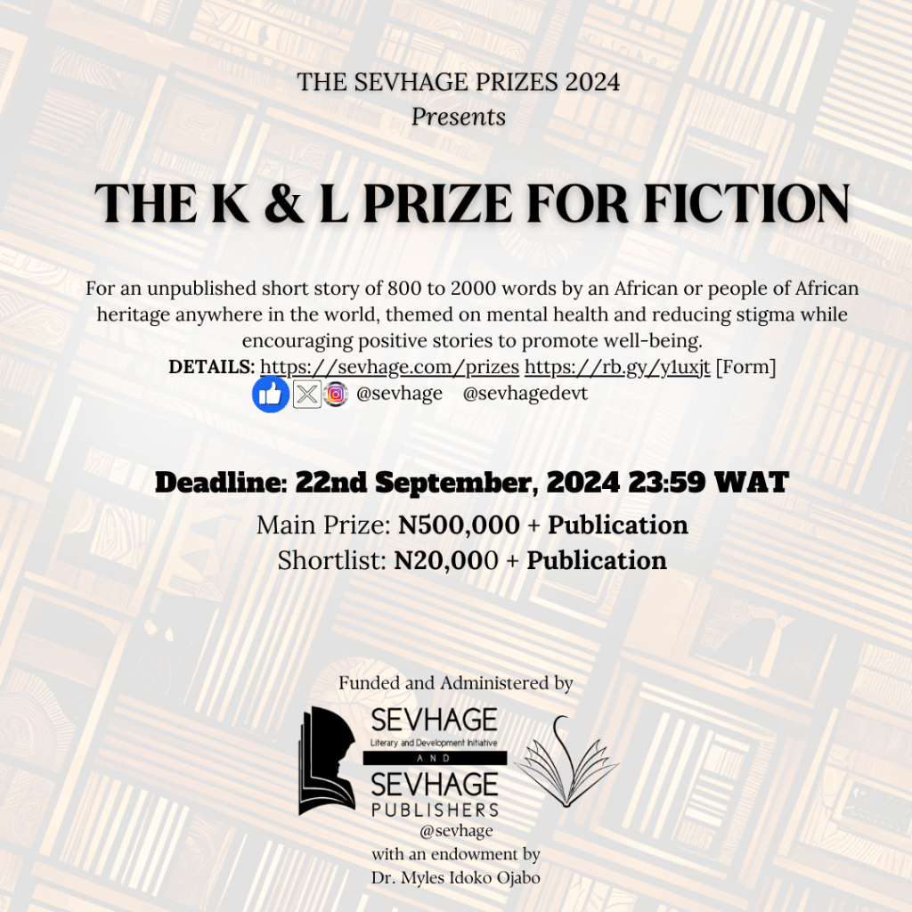 With a star prize of Five Hundred Thousand Naira and twenty thousand naira for shortlisted entries, this SEVHAGE Short Fiction Prize is for a work of short fiction (800-2000 words) that focus on mental health and reduce stigma while encouraging positive stories to promote well-being. For guidelines on this prize, please click on this link. This prize money is majorly in part, courtesy of an endowment by Dr Myles Idoko Ojabo.